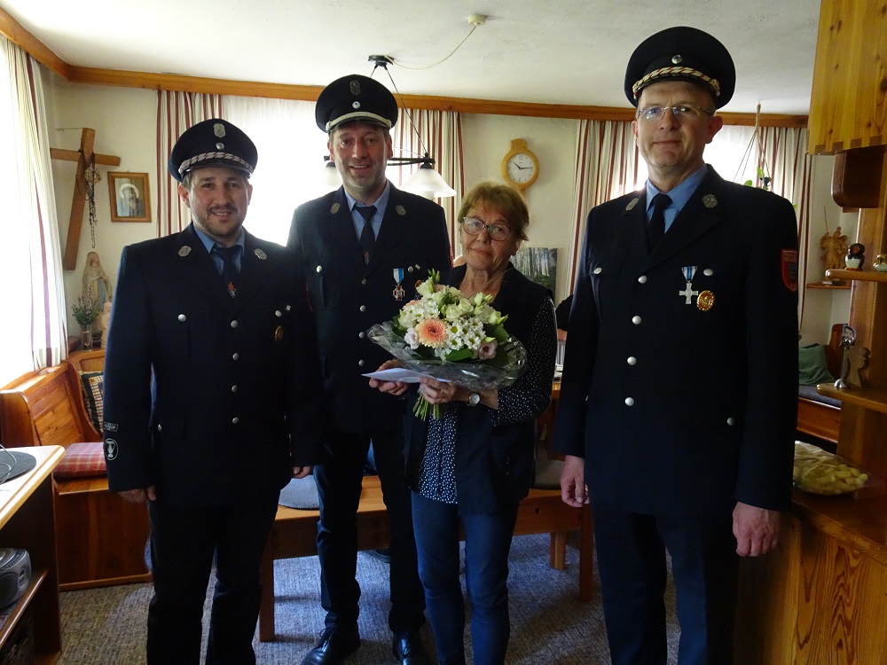 Die Abordnung der Rieder Wehr überreichte ein Geschenk sowie Blumen an die Jubilarin und bedankte sich herzlich für das jahrelange Engagement und die Unterstützung als Festmutter.